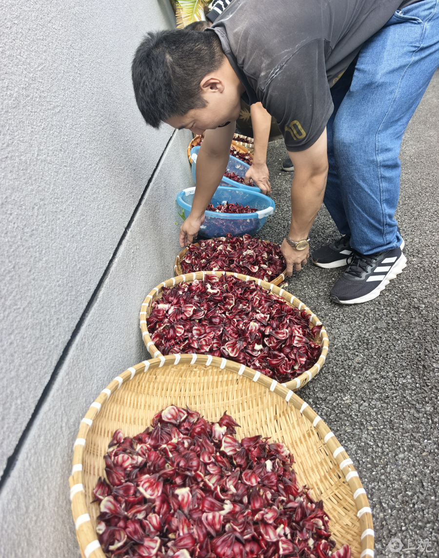 近日,上海奉贤区西渡街道北新村的洛神花迎来丰收季。