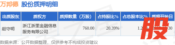 证券之星消息,万邦德(002082)1月4日公开信息显示,股东赵守明向浙江浙里金融信息服务有限公司合计质押760.0万股,占总股本1.24%。质押详情见下表: