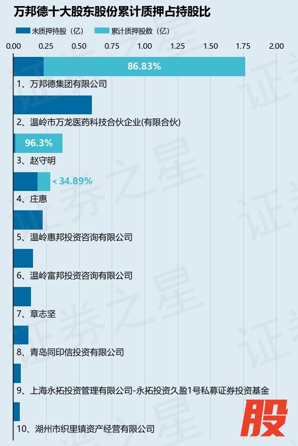 截止本公告日,股东万邦德集团有限公司已累计质押股份1.53亿股,占其持股总数的86.83%,股东赵守明已累计质押股份3588.96万股,占其持股总数的96.3%,股东庄惠已累计质押股份985.0万股,占其持股总数的34.89%。本次质押后万邦德十大股东的累计质押股份占持股比例(占持股比例的计算以公司最新一期财务报表公布的十大股东的持股总数为基准)见下图: